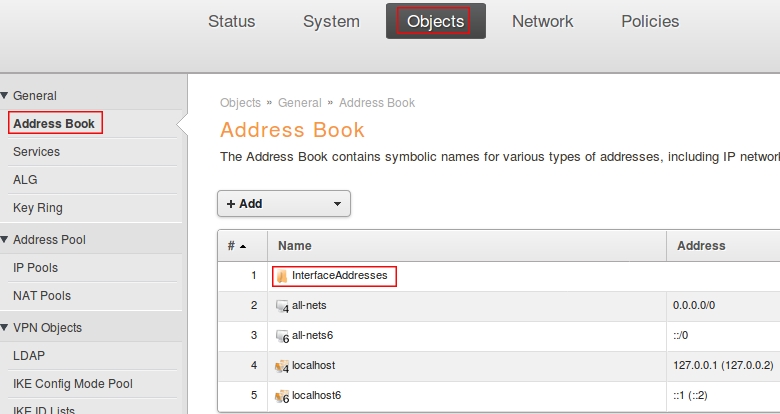 Пройдите в Web интерфейсе Objects → Address book → InterfaceAddresses.