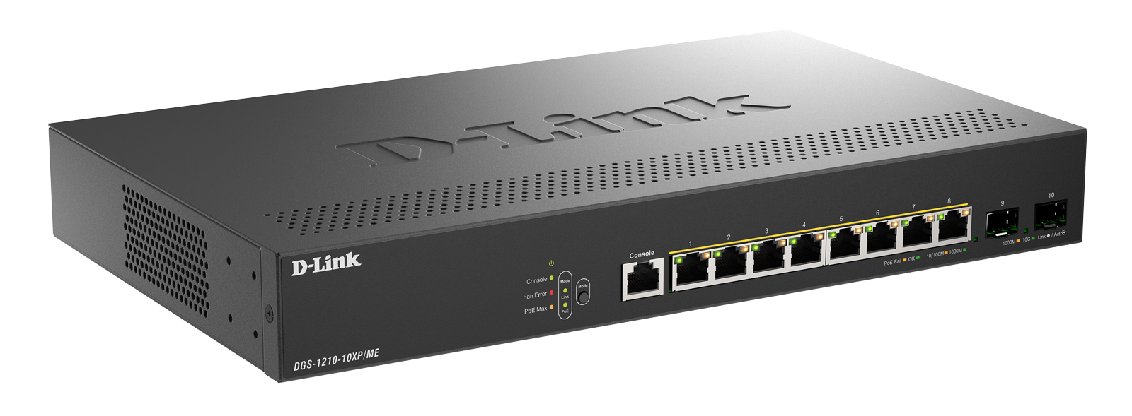 8 портов данного коммутатора поддерживают стандарт IEEE 802.3at PoE. Каждый порт PoE подает питание мощностью до 30 Вт при общем бюджете коммутатора 240 Вт, что позволяет пользователям подключать к DGS-1210-10XP/ME устройства, совместимые со стандартом 802.3at. Это позволяет размещать оборудование в труднодоступных местах вне зависимости от расположения электрических розеток и минимизировать прокладку кабеля. Кроме того, DGS-1210-10XP/ME поддерживает технологии Perpetual PoE и Fast PoE. Технология Perpetual PoE сохраняет подачу питания в линию при программной перезагрузке («warm reboot»). Технология Fast PoE обеспечивает подачу питания в линию после перезагрузки по питанию («cold reboot») до полной загрузки OC коммутатора.